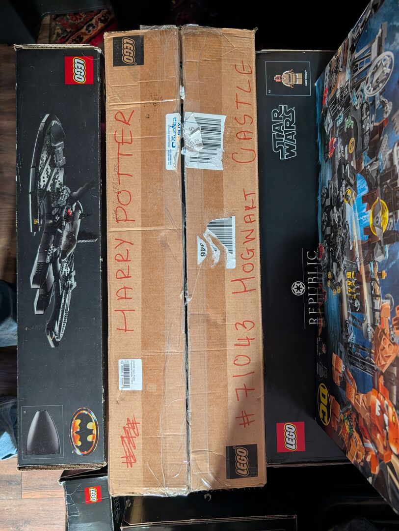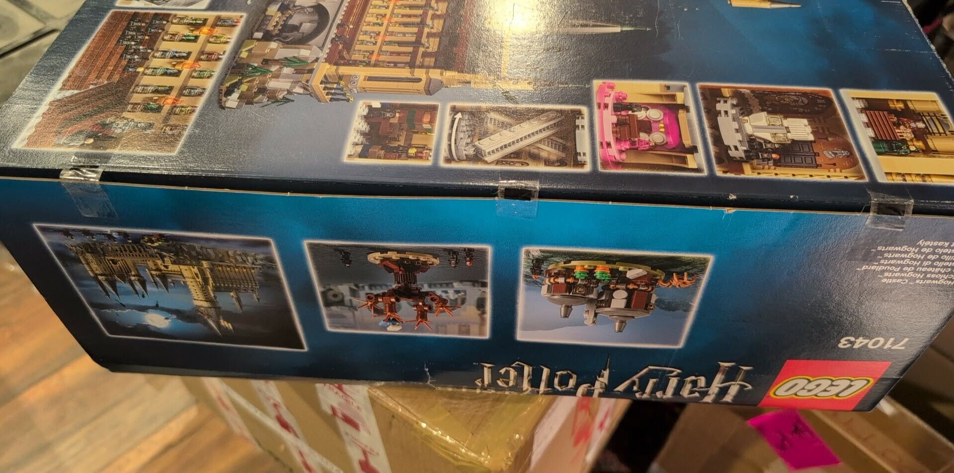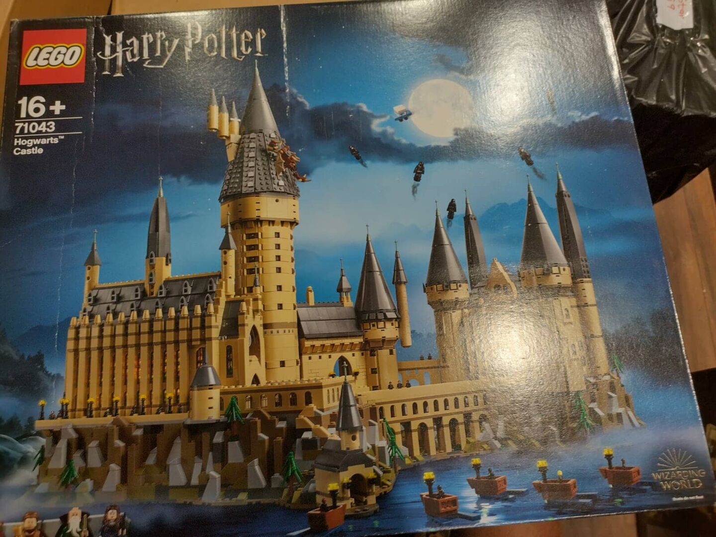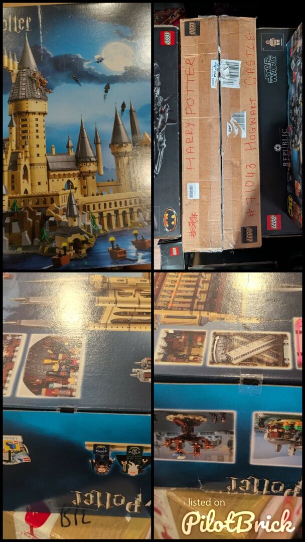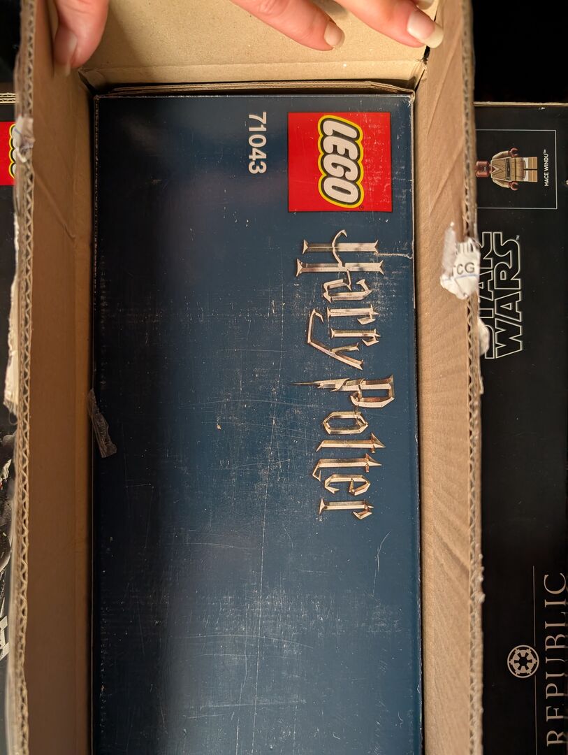 Versiegeltes Schloss Hogwarts mit brauner Transportbox von Lego.
