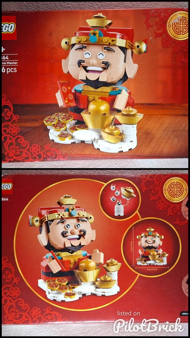 LEGO 40864 Fortune Master ist ein saisonales Set für traditionelle chinesische Feste, das im Jahr 2026 erscheint und 386 Teile enthält. Im Mittelpunkt des Bausatzes steht eine Sammelfigur in traditioneller rot-goldener Kleidung mit drei austauschbaren Augenpaaren und einem versteckten Fach zur Aufbewahrung von Ersatzteilen. Die Szene enthält Glückssymbole wie Goldmünzen und rote Umschläge, die dekorativ aufgestellt sind.