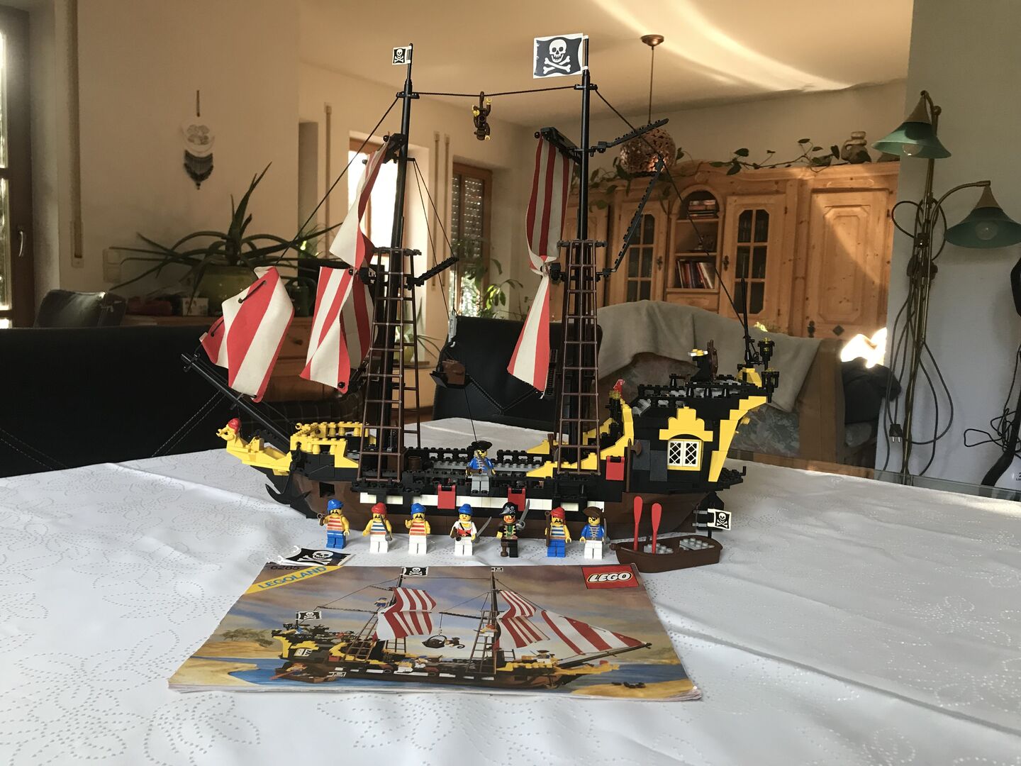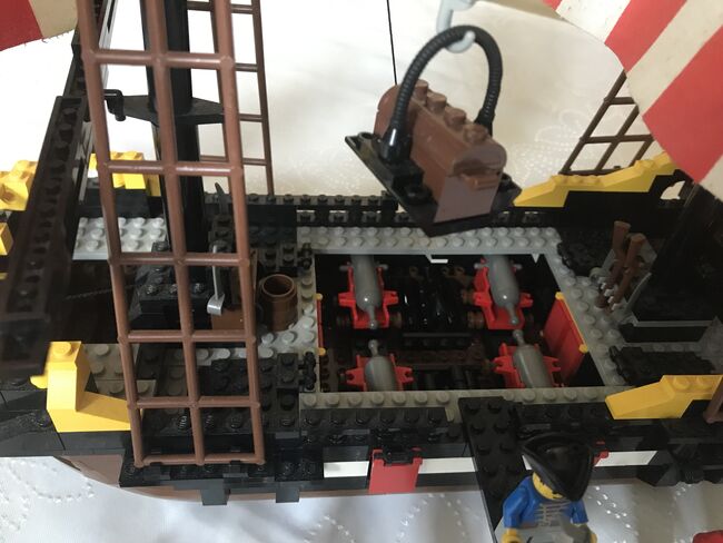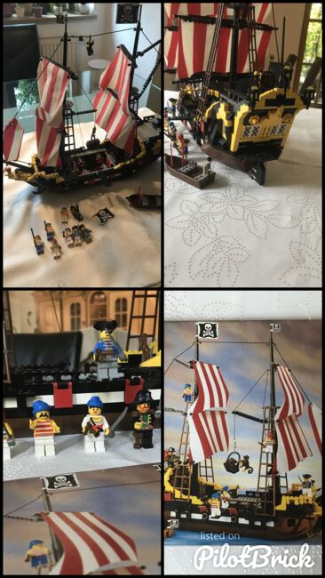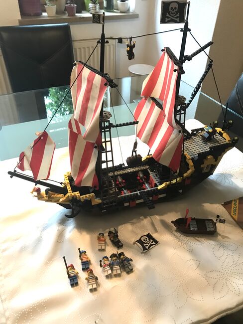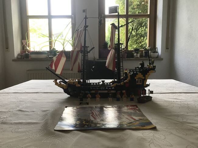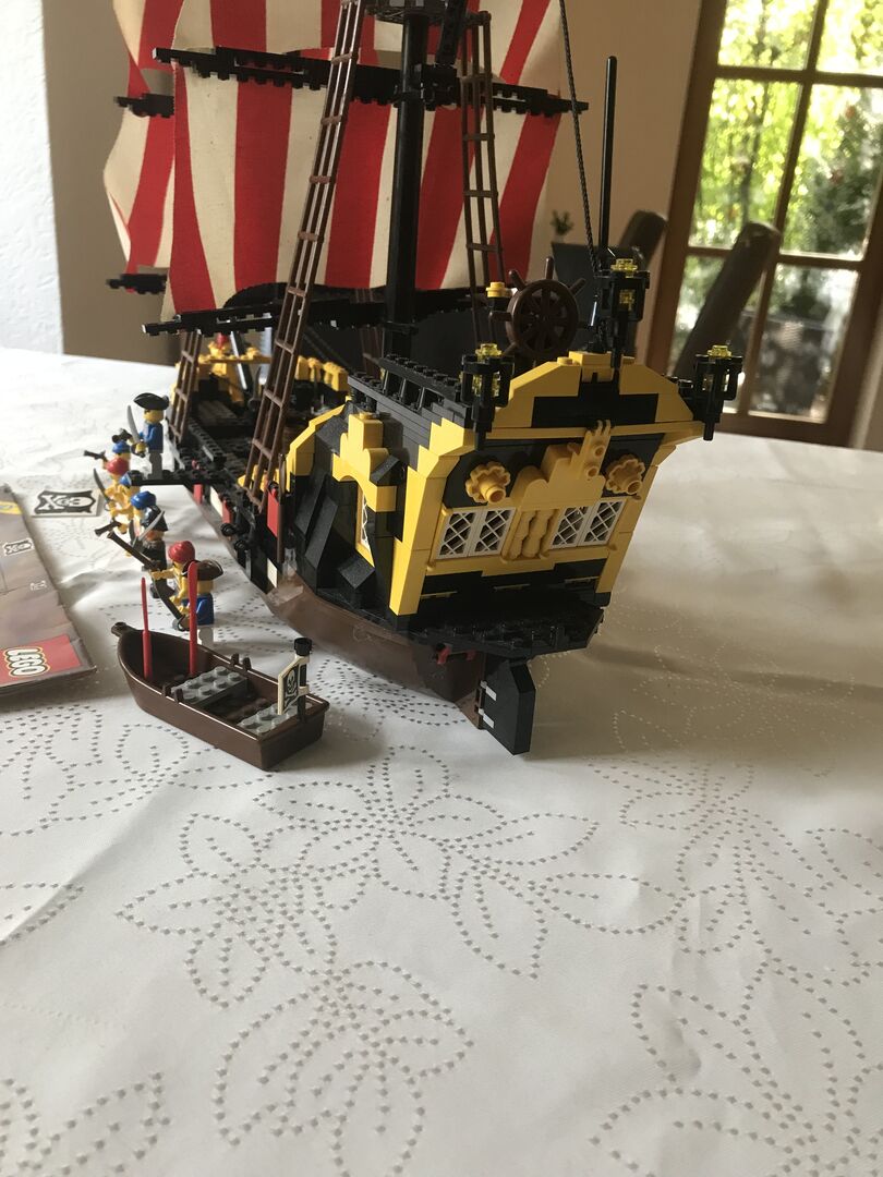 Zum Verkauf (wegen Auflösung Spielesammlung) steht das seltene LEGO 6285 Piratenschiff Black Seas Barracuda inklusive original Anleitung aus dem Jahr 1989. Das Schiff ist gebraucht (es wurde damit gespielt), vollständig (nach original Anleitung) und in gutem bis sehr gutem Zustand (etwas staubig). Alle Figuren (Piraten, Papagei, Affe) und Anbauteile (Segel, Kanonen, Flaggen usw.) sind vorhanden. Es gibt folgende „Blessuren“: - Eine der großen Piratenflaggen hält nicht mehr richtig (lässt sich sicher mit einem Heißluftfön wieder „hinbiegen“). - Eine der roten „Flaggen“ für die Kanonen ist beschädigt (vgl. Foto) - Eines der Segel hat zwei Löcher bei denen ich mir nicht sicher bin, ob die original sind Das Schiff ist derzeit aufgebaut und kann in 91315 Höchstadt besichtigt und abgeholt werden. Versand ist ab 9,00 Euro via DHL möglich (neutrale Umverpackung, das Set wird dann zerlegt bzw. teilzerlegt). Barzahlung bei Abholung; Paypal bei Versand. Fragen beantworte ich gerne. Auch kann ich auf Wunsch noch zusätzliche Fotos machen. Schaut euch auch gerne noch meine anderen Lego Sets an. Ihr könnt die auch als Konvolut erwerben. Privatverkauf, daher gilt: Der Verkauf erfolgt unter Ausschluss jeglicher Sachmängelhaftung. Kein Umtausch, keine Garantie, keine Rücknahme. Die Haftung auf Schadenersatz wegen Verletzungen von Gesundheit, Körper oder Leben und grob fahrlässiger und/oder Vorsätzlicher Verletzungen meiner Pflichten als Verkäufer bleibt davon unberührt. Es wird nur das Set verkauft. Alles was sonst noch auf den Bildern ist (Couch, Tisch, Schrank usw.) ist nicht Teil des Angebots.
