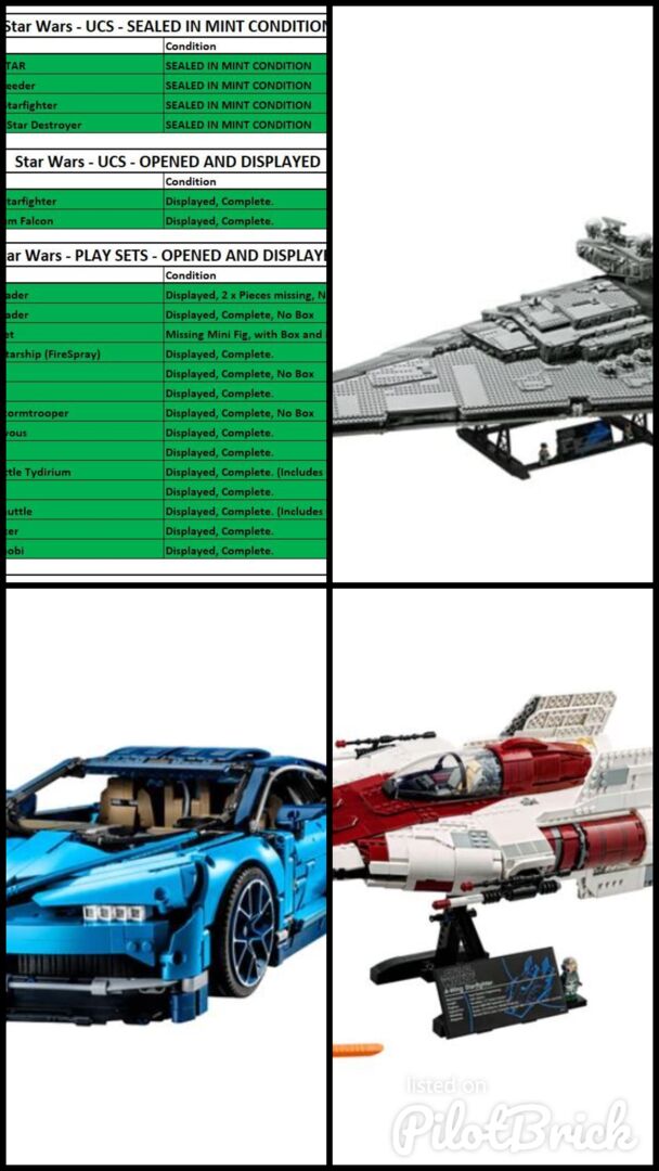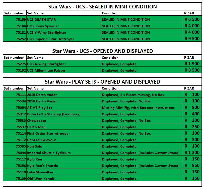 Satznummer Satzname R ZAR 75159 UCS TODESSTERN R6 500 75144 UCS Schneeschleuder R4 000 75181 UCS Y-Wing Starfighter R4 000 75252 UCS Imperialer Sternenzerstörer R9 500 75275 UCS A-Flügel-Sternenjäger R1 900 75192 UCS MIlennium Falcon R8 500 75111 2015 Darth Vader R100 75534 2018 Darth Vader R100 75054 AT-AT Spielset R900 75312 Boba Fetts Raumschiff (FireSpray) R400 75530 Chewbacca R200 75537 Darth Maul R250 75114 Sturmtruppler der Ersten Ordnung R100 75112 General Grievous R300 75535 Han Solo R100 75094 Imperiale Raumfähre Tydirium R1 300 75117 Kylo Ren R150 75256 Kylo Rens Raumschiff R950 75110 Luke Skywalker R150 75109 Obi-Wan Kenobi R150